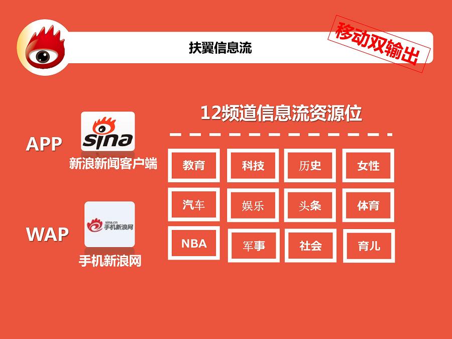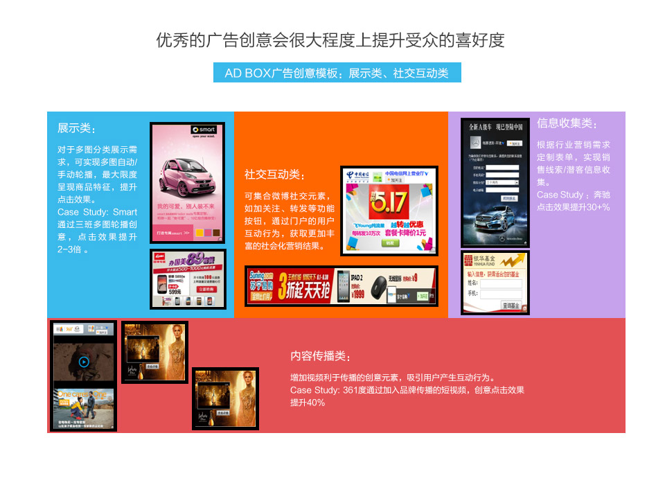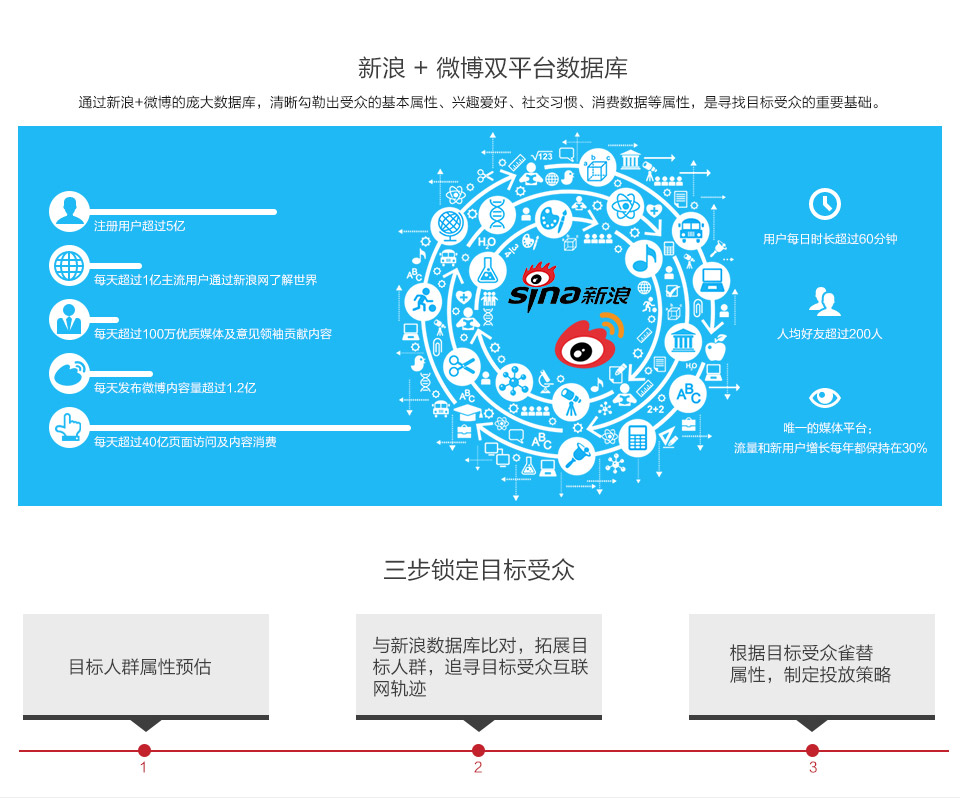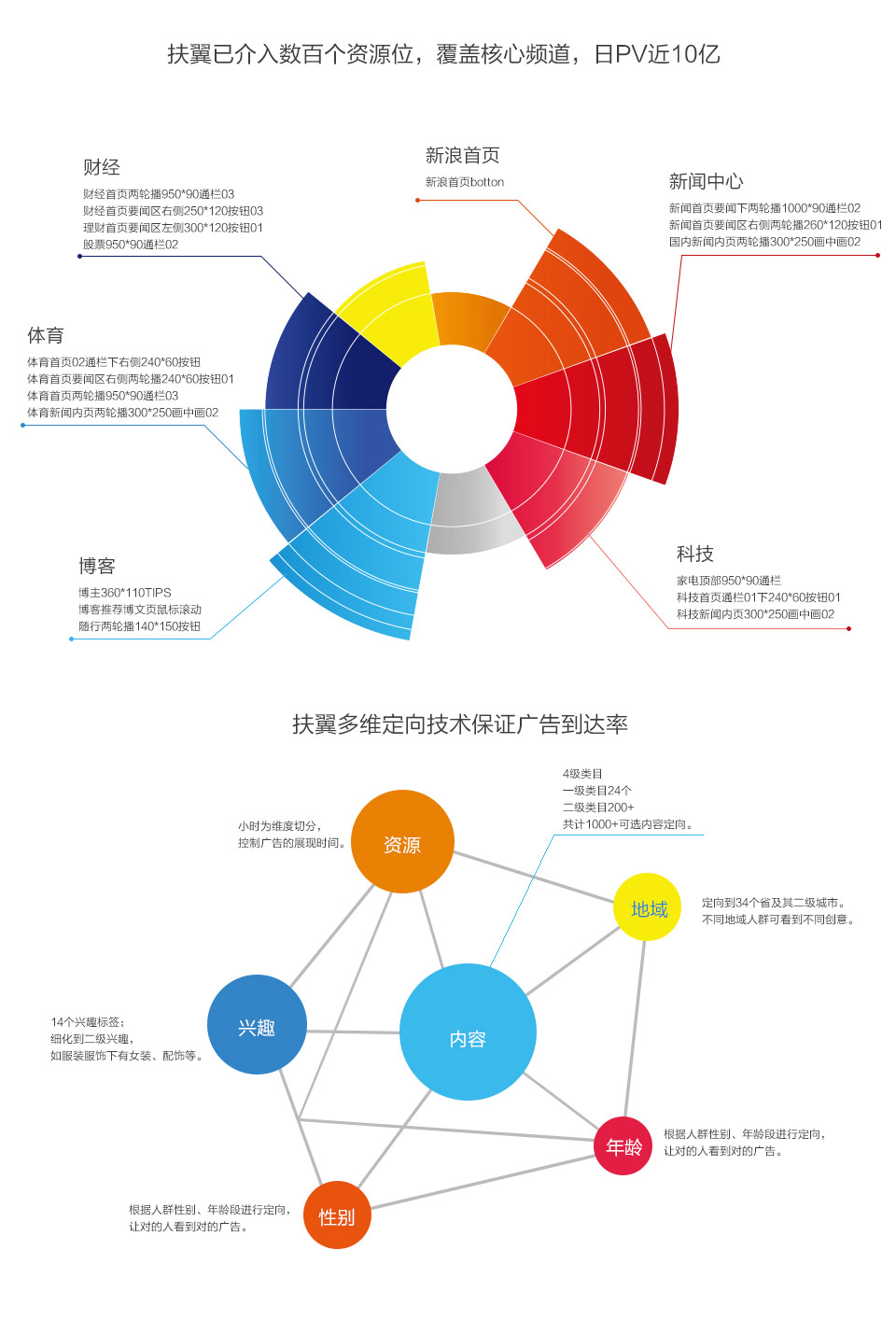 广告投放基于新浪SAX( Sina Ad eXchange)营销平台。新浪拥有每天超过1亿主流用户,超过40亿页面访问及内容消费,微博注册用户超过5亿,人均好友超过200人,通过用户数据积累,可以为SAX的每一个流量打上属性标签。SAX整合了包括新浪首页、财经、新闻、体育等在内的十多个优势频道页的大幅品牌广告位资源。视觉冲击强烈,更容易影响受众。