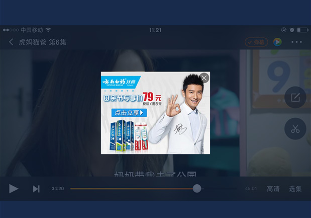 悬停、贴片广告,在用户主动点击暂停后,第一时间以极具视觉冲击力的画面展现在用户眼前